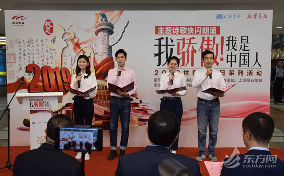 “我的母语是热血一般的黄河的波涛/我的母语是群星一般的祖先的名字/我的母语是春蚕口中吐出的丝绸古道/我的母语是春鸟舌尖跳动的民歌中国……”就读小学二年级的沈唐宁声情并茂地演绎《我有祖国我有母语》。今天上午,上海书城福州路店,一场由各方读者参加的诗歌快闪活动——“我骄傲,我是中国人”吸引了市民停下脚步,在朗诵中领略文字之美。