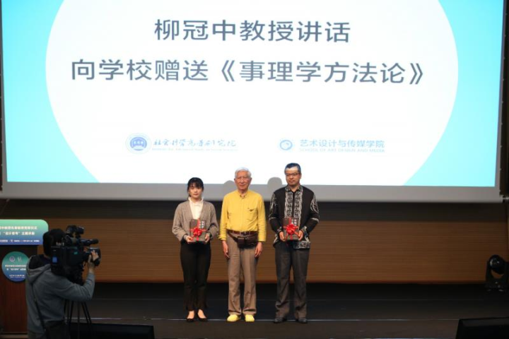 华理人文社会科学处处长范体军首先向师生们介绍了柳冠中教授在中国工业设计产业的成就与影响力。中国工程院院士、华理副校长钱锋代表学校为柳冠中教授颁发名誉教授证书并佩戴校徽。钱锋强调,柳冠中先生受聘为华理名誉教授,是清华与华理的再一次握手,是国内一级学术大师对华理设计学科的强有力支持。他相信柳冠中教授加盟华理后,将对学校艺术设计领域的人才培养、科学研究等提供巨大帮助,进一步推动相关学科发展。柳冠中教授感谢华理的邀请和聘任,他希望积极推进交流合作,为华理建设和发展贡献力量。随后,柳冠中教授向华理赠送其代表作《事理学方法论》,师生代表上台领书并表示感谢。
