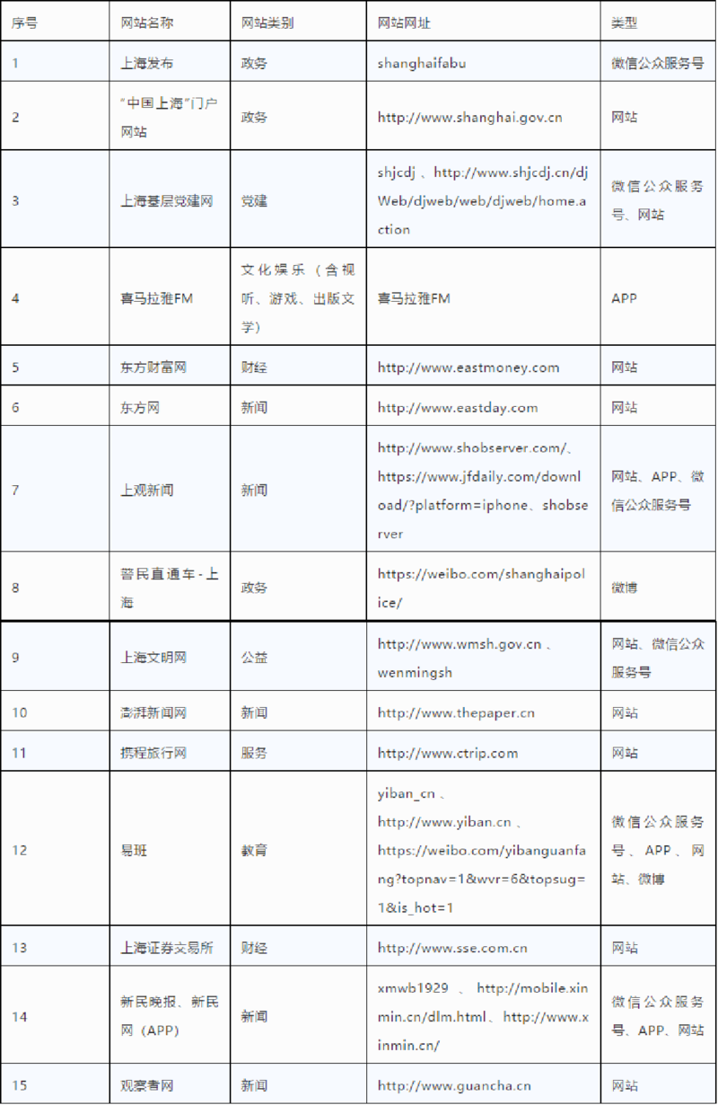 获得本届评比最佳网站称号的15家网站为:上海发布、“中国上海”门户网站、上海基层党建网、喜马拉雅FM、东方财富网、东方网、上观新闻、警民直通车-上海、上海文明网、澎湃新闻网、携程旅行网、易班网、上海证券交易所网站、新民晚报、观察者网。