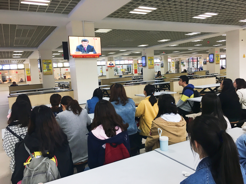 在奉贤校区图文信息中心敬贤堂、大学生活动中心等地,各学院党委副书记、全体专兼职团干部、辅导员和学生代表等也同时收看学习。此外,在学校的图书馆、食堂、宿舍、实验室等地,师生们纷纷通过网络、电视等收听收看了现场直播。