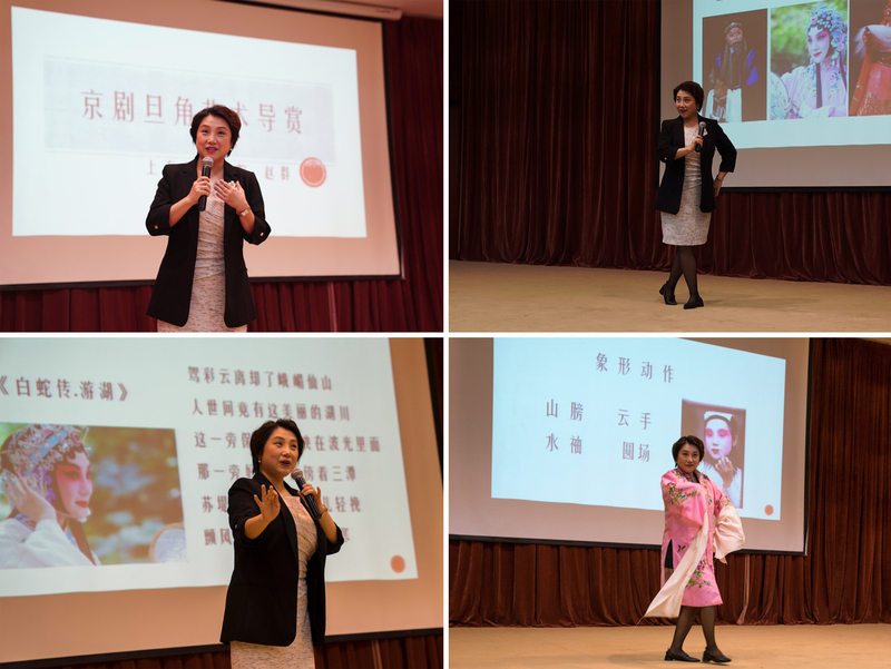 4月29日晚,奉贤校区图书馆敬贤堂座无虚席,上海戏剧学院教授、国家一级演员赵群应邀带来主题为“品位国粹精髓,聆听艺术之声”的京剧旦角艺术导赏讲座。我校学工部副部长郑东、化工学院党委副书记高艺霞,奉贤区文化馆创作部副主任吴春华等人出席了活动。我校化工学院各年级辅导员及200余名师生共同聆听了讲座。