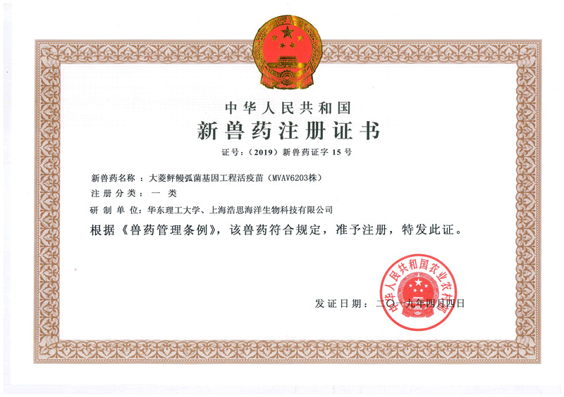 2010年,大菱鲆鳗弧菌基因工程活疫苗研发成果转化上海浩思海洋生物科技有限公司,并在校企双方的共同协作下完成了产品的新药注册,于2019年4月正式获批国家一类新兽药证书。这是国际上首例被行政许可的海水鱼类弧菌病基因工程活疫苗,代表着我国水产疫苗研发的综合技术水平已经跻身国际前列。团队主要成员马悦博士、刘晓红博士、吴海珍教授和肖婧凡副教授等在病原诊断、疫苗评价、临床试验、生产应用等各个环节作出了积极贡献。