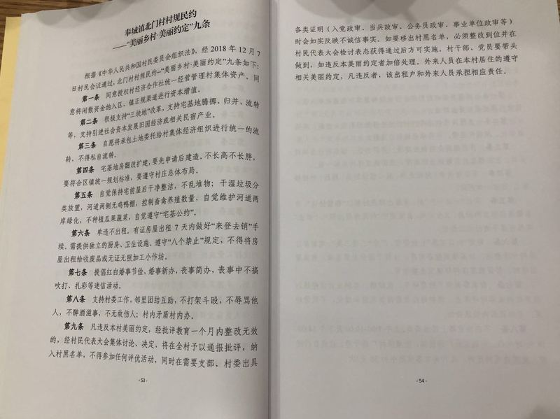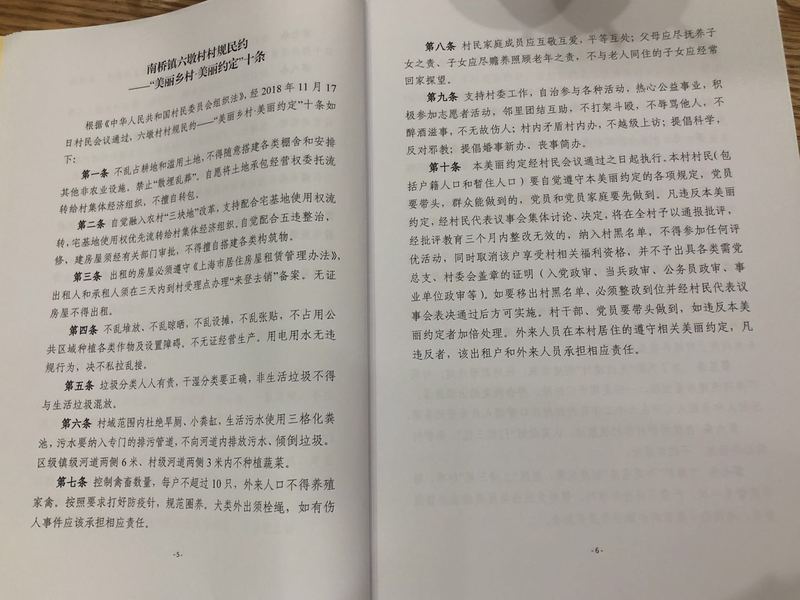 奉贤正式推进各村制订“美丽约定”村规民约是去年夏天的事。其时,正值上海市村民委员会换届选举,各村新班子上任后要重新修订村规民约。“我们想借此机会产生一批老百姓真正参与制定的、能够切实发挥治理作用的约定。”奉贤区地区工作办公室主任汪瑜蓉说。