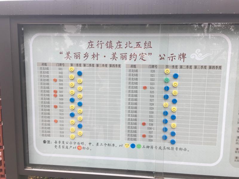 这些公示牌如今就树在奉贤全区2300多个村民小组里最显眼的位置,上面张贴着小组内每户人家在过去一季度里的履约情况。在五四村,根据“美丽约定”第十条,凡违反约定中的一条,且在三个月内整改无效的,就要纳入村黑名单。体现在公示牌上,就是一张哭脸的标记。