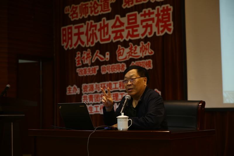 包起帆教授作了题为“明天你也是劳模”的主题报告。他首先从“抓斗的故事”讲起,通过“爱国是创新之本”“敬业是创新之根”“诚信友善是创新之源”三个篇章回顾了不同阶段的创新经历和感悟。他通过一个个生动精彩的故事、一句句朴实真切的话语,生动诠释了“劳动创造幸福、知识改变人生、责任成就事业、创新铸就辉煌”的深刻道理。他希望学生们能树立报效祖国、服务人民的理念,抓住人生学习的大好机会,互敬互爱,从同学友谊着手,学会做人,融入社会大环境,为明天“大众创业、万众创新”做好准备。