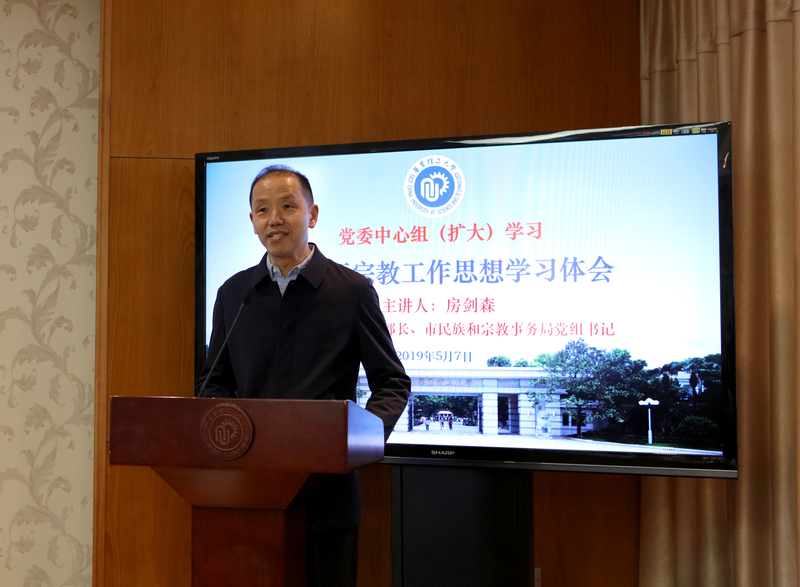 为深入学习贯彻习近平总书记关于民族宗教工作重要讲话精神,切实做好高校民族宗教工作,5月7日上午,华东理工大学在和平楼第二会议室举行党委中心组(扩大)学习,上海市委统战部副部长、市民族和宗教事务局党组书记房剑森应邀来校作“习近平宗教工作思想学习体会”专题辅导报告。校党委书记杜慧芳,校长、党委副书记曲景平,党委副书记宋来,党委副书记、纪委书记沈志超,副校长钱锋、吴柏钧、刘昌胜、李涛等出席报告会,党委副书记陈麒主持报告会。