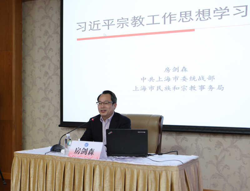 图片说明:上海市委统战部副部长、市民族和宗教事务局党组书记房剑森作辅导报告