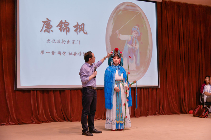 表演中还穿插了关于京剧服饰、音乐、化妆等方面的知识普及和互动,这些环节让师生更易于理解京剧艺术这种程式化、写意型的艺术语言和特点。