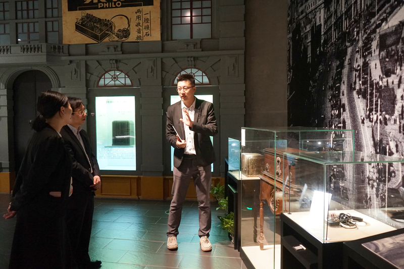 孙涤非向档案馆一行讲解了上海无线电博物馆的基本情况,并详细介绍了上海无线电博物馆的筹建始末、展品保管、展线布置、布展技术、多媒体运维等情况。上海无线电博物馆由上海仪电资产经营管理(集团)有限公司投资建设,展示面积1000m2,共分“无线印象”“历史光影”“岁月留声”“无线致远”4个展区。博物馆以“无线电”为主题,陈列了收音机、录音机、电视机、收发电报机等10余个品种近500件展品,展品主要由知名收藏家张明律先生捐赠。2017年11月,无线电博物馆正式对公众免费开放,截至目前,接待量已达3万人次。
