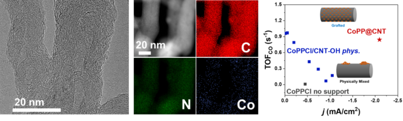 含有非贵金属中心(铁、钴、镍等)的卟啉及其衍生物可以高选择性地将CO2转化为CO,而基于此类活性物种的负载型催化剂在制备过程中极易形成分子间π-π堆积,从而导致严重的催化剂聚集现象。为了解决该问题,我校科研团队发展了一种利用共价键锚定卟啉分子的制备方法。研究人员在碳纳米管上引入羟基(-OH)、在卟啉分子轴向引入氯基(-Cl),通过取代反应将卟啉固定至碳纳米管表面。研究表明,卟啉分子与碳纳米管以共价键结合,并基本实现了单层分散,表现出极高的CO2电催化活性和CO选择性,解决了该催化体系研究中高负载量与高分散度不可兼得的难题。