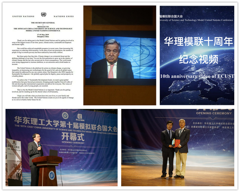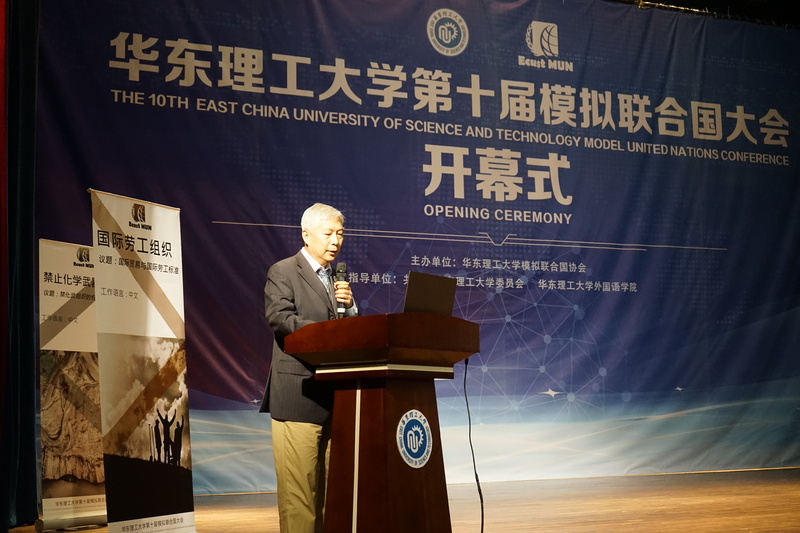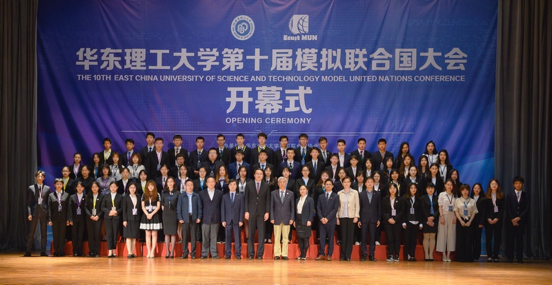 5月17日下午,华东理工大学第十届模拟联合国大会在奉贤校区大学生活动中心剧场开幕。联合国秘书长安东尼奥·古特雷斯发来贺信,前中国联合国协会副会长兼总干事刘志贤先生、校学工部兼武装部部长倪炜 、校团委书记侯宇、教务处副处长沈文君、国际合作与交流处副处长彭德雷,外国语学院党委书记王喆、副院长吴建伟和赵宏、党委副书记樊俊,以及来自北京大学、上海交通大学、西安交通大学等28所高校的110名模联代表和华理师生共计500余人出席开幕式。