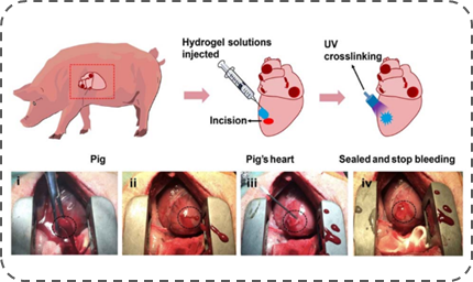 基于这些技术优势,朱麟勇研究团队于2014年进一步与相关医学单位合作,在动物模型上验证以上光原位凝胶技术的有效性(见图C、D、E)。经过验证证实,该水凝胶材料具有以下几方面作用:一是可作为创面止血封闭材料,其高强度、强组织粘附与快速固化的特征可实现大动物心脏穿透伤导致大流量出血与动脉损伤的瞬时封闭(Nat. Commun., 2019, DOI: 10.1038/s41467-019-10004-7);二是可作为干细胞或其外泌体原位凝胶支架,其组织粘附特性有助于软骨缺损的修复,并促进新生软骨与旧软骨间的整合一体化(Nanoscale, 2017, 9, 4430);三是可作为创面的促修复材料,在无需任何改性条件下,促使自体富含血小板的血浆(PRP)发生“光偶联反应”交联,原位形成高组织粘附力的促创面修复凝胶(Acta Biomaterialia, 2017, 62, 179)。