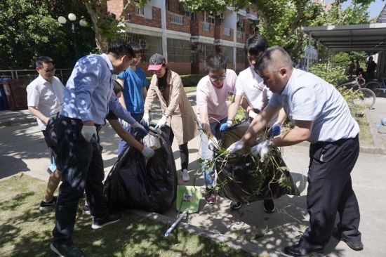 这是华东理工大学践行劳动育人理念,以“用辛勤劳动打造美丽校园”为主题在徐汇校区学生宿舍区周围开展的党日活动,后勤中层骨干、党团员代表以及共建支部的教工、学生党员、物业企业代表共150余人参加本次活动,共同参与义务劳动,为提升校园环境出一大把汗。