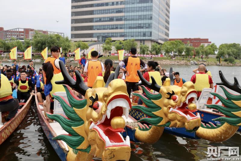 央广网上海6月1日消息(记者唐奇云)端午至,赛龙舟。第12届上海高校外国留学生龙舟赛今天(1日)下午在华东理工大学奉贤校区通海湖畔隆重举行,来自沪上29所高校的千余名国际留学生相聚于此,参与龙舟竞渡,体验中国传统文化。(本文图 央广网记者 唐奇云 摄)