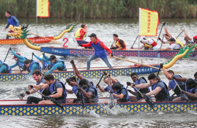 来自沪上29所高校的千余名国际留学生参与龙舟竞渡,体验中国传统文化。经过激烈角逐,上海对外经贸大学代表队摘得桂冠,华东师范大学代表队、东华大学代表队分获第二、第三名。