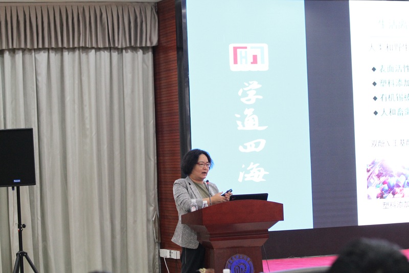我们的生活与化学息息相关。胡建英聚焦阻燃剂,介绍了国外有关阻燃剂的法律法规、阻燃剂使用的历史变迁以及国际化学品管理中的四个关键要素:高产量、极高持久性和极高生物蓄积性、致畸致癌、或是内分泌干扰物,并在之后分别举例,进一步探讨了更加科学地评价化学品的危害、更加精准地从复杂环境中鉴定具有毒性效应的化学污染物质的方法。在讲到研究区域对食物网放大性判断的影响时,胡建英结合渤海湾的生物实验进行讲解,评价了一系列化学物质如DDTs,HCB,PCBs,二恶英,PBDEs,多环芳烃等的食物链行为,并通过介绍野生中华鲟的鱼卵在低剂量有机锡的暴露下子代出现眼睛缺损和躯体弯曲的现象表明了野生生物在低剂量长期暴露下的高风险性。最后,胡建英分享了一张大树冲破屋顶茁壮生长的照片,并鼓励在场师生:“一棵树都可以不从土壤中生长,我们更是能够另辟蹊径,走出自己的一条路来。”