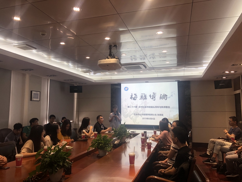 在农历新年中,各地都存在着诸多代表地方特色的拜年仪式,特别是北方的乡村社会中,“磕头”这一传统的拜年仪式由来已久,磕头拜年有着怎样的起源?不同的磕头方式又是如何分类的?仪式背后又有那些特殊的社会职能?为了解开这些疑惑,社会与公共管理学院博士生张贯磊于6月6日做客第二十六期梅雅博论,在研究生楼806室作了题为“乡村社会中的磕头拜年仪式与秩序整合”的分享。