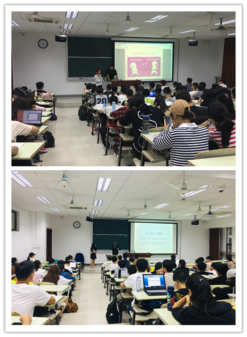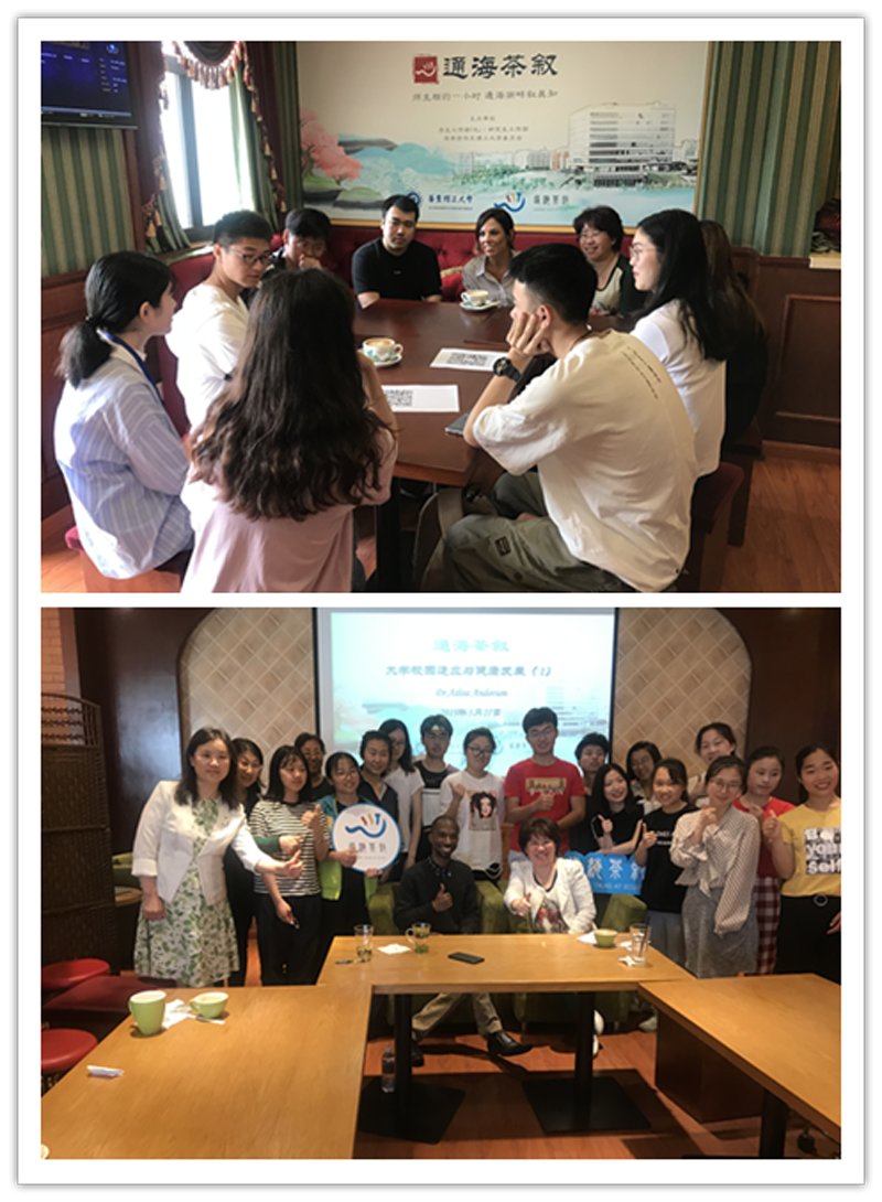 5月27日中午,Adisa Anderson与Cynthia Medina两位博士分别在大活咖啡屋与教师公寓咖啡屋参加了主题为“大学校园适应与健康发展”的“通海茶叙”活动,两位博士与学生们分享了加州伯克利分校的校园生活及适应之道。下午,两位博士与全校及海湾高校专兼职咨询师进行了“校园危机预防、评估与干预”的主题研讨交流,介绍了抑郁/危机的常见信号,强调咨询师要提高对危机信号识别的敏感性,增强危机应对的时效性。晚上,两位博士参与我校“新生心理健康教育”课程教学,分别为大一学生讲授了主题为“大学生亲密关系管理”与“大学生压力管理”的课程,学生们积极提问,现场互动热烈。此举是我校心理健康课程教学国际化的积极探索。