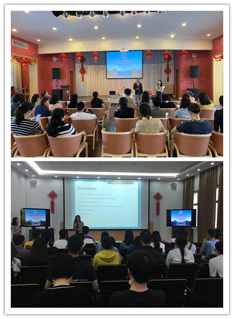 5月31日上午,两位博士与我校专兼职咨询师及部分心理辅导员一起探讨了大学生心理健康状况,分享了国外心理健康与咨询服务及危机识别与干预的经验与做法。下午,Adisa Anderson博士为工会干部与教职工作了题为“教师心理健康维护”的专题讲座,细致入微地分享了教师压力与职业倦怠的表现及原因,引导大家要学会明确自己的选择,学习运用周边的资源去应对。Cynthia Medina博士为研究生作了题为“有效应对研究生生活”的专题讲座,引导学生们学习识别压力与自我觉察,通过积极的自我肯定、目标设置、时间规划、自我关照、寻求支持、适度控制电子产品等应对策略,实现研究生生活的有效适应。