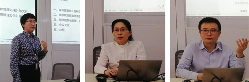 商学院党委宣传委员、副院长侯丽敏为在场人员解读《商学院新媒体管理办法》,对新媒体的维护管理与内容管理作了重点介绍,同时对商学院所有二级媒体、三级媒体进行梳理,并将各个媒体账号的管理责任落实到人。商学院院长助理、办公室主任李宏辉解读了《商学院电子屏的管理办法》及申请使用流程,希望通过建立健全电子屏管理相关制度,保证商学院大楼电子屏信息发布工作的有序开展,进一步提升商学院的公众形象。