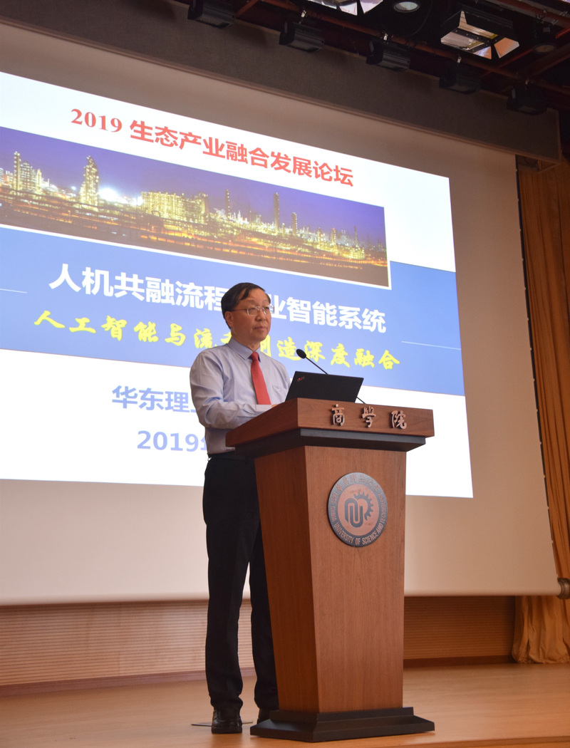 随后,生态产业融合发展论坛正式开始。钱锋作了题为“人机共融流程工业智能系统——人工智能与流程制造深度融合”的专题报告。报告从人工智能赋能新时代,国内外人工智能技术发展进程和我国人工智能发展的政策环境出发,从流程制造高质量转型发展和人工智能赋能制造业两个角度阐述了二者互相融合的必要性。他结合具体应用场景案例分析,重点探讨了以“智能制造+绿色制造—>高端制造”为目标的智能优化制造愿景,并围绕人工智能与流程制造深度融合实现智能优化制造凝练了相关工程科学问题。报告以问题为导向,以需求驱动、应用导向为目标,提出了当前流程工业制造系统智能化的主要研究内容和关键技术,并给出了工业应用示例。