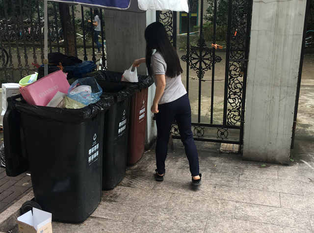 她告诉记者:“我在上个星期就开始这么做了,因为我喜欢打包在寝室吃饭,所以我吃好后得自己把饭菜分好。今天出门我还特地提醒了我的室友们,今天开始实施垃圾分类。”