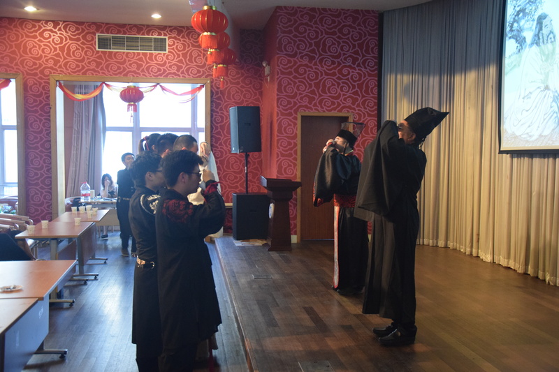 乡饮酒礼是最早起源于周代乡学的宴饮礼节,本为显示尊老、养老,后逐渐演化成举送人才时的“敬贤”礼仪。典礼的最后,毕业班全体以茶代酒,向王利民教授行“乡饮茶礼”。对于毕业生,王利民教授深情寄语:“祝福毕业学子在未来的生活和工作中,做一个传承传统文化的中国人,同时面向世界,谨记圣人言‘君子务本,本立而道生’,知行合一,书写美好人生璀璨的篇章!”