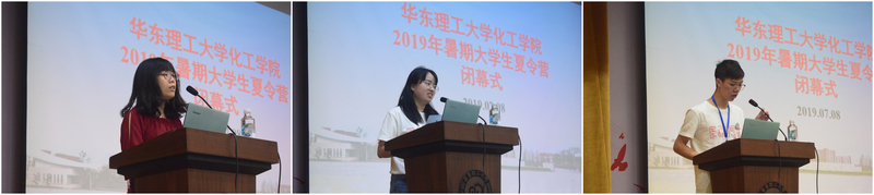 朱学栋作总结发言,肯定了营员们的各项表现。他表示,化工学院为学生提供了良好的科研和学习平台,希望各位同学选择来华理化工学院学习。班主任代表李宇璇、营员代表郑州大学钟嘉怡和中国石油大学司道润分别作了发言。李宇璇表示,3天的班主任工作虽然辛苦,但收获很大,相信明年这个时候,华理会变得更美、更新,希望同学们能在这美好的环境中学习、奋进。营员们感谢了华理为他们作的精心准备,感谢教授们和工作人员的辛勤付出,表示这次夏令营让他们全方位、深层次、近距离地了解了华理化工学院,更坚定了来华理读研的决心和信心。