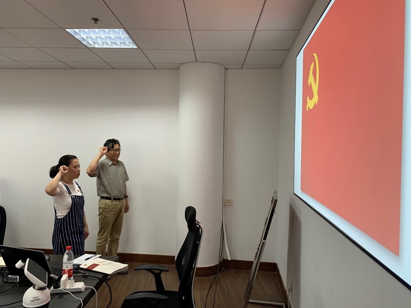 实装处新党员陈晓雯在袁洪学带领下宣读入党誓词,并向党组织和所有党员表决心。