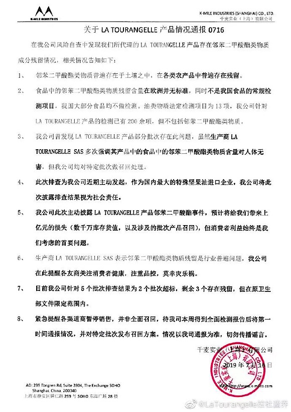 7月16日,LaTourangelle的进口商“千麦实业”通过微博发布声明,称公司代理的拉杜蓝乔产品存在邻苯二甲酸酯类物质(塑化剂)成分残留,要求各渠道商暂停销售,并对特定批次产品发布召回方案。
