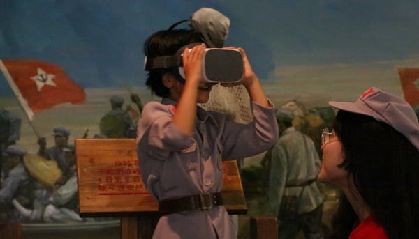 这是华东理工大学商学院“传承红色基因”团队结合新型虚拟现实技术,利用VR实景还原馆内场景,将长征精神、长征故事再叙述,并假以新的数字化话语言进行再现。除此以外,VR一体机一方面在很大程度上可以解决纪念馆场地有限,不足以承载高峰时期的游客量的问题;另一方面,由于部分馆内建筑年代久远,难以承载游客继续参观、使用,借助VR虚拟现实技术和设备,就可以很好地实景模拟现实。