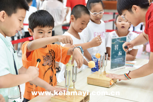 7月25日,克拉玛依科技馆,小朋友通过科学实验学习知识。当天,科技馆携手华东理工大学E-Lab科普教室共同开展了“文明与时代同步,科学和生活相伴”系列科普课堂活动。活动现场,小朋友们免费参加平抛运动、马德堡半球、共振等简单有趣的实验,亲身感受声音、大气压、光、电等的特性。