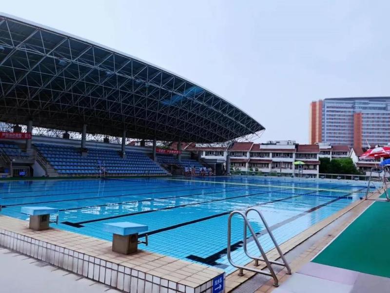 环境:复旦大学南区游泳池位于二楼,长50米×宽25米,为室外标准游泳池。每年夏季开放,为露天半开放式游泳池,水质优良。配备专业的救生员队伍,目前已安全开放五十余年。