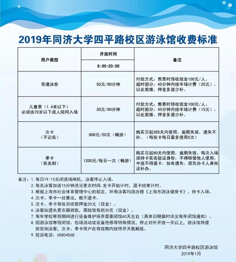 环境:四平路校区游泳馆位于杨浦区四平路1239号校园内,系50米标准恒温泳池,常年水温保持在28℃。同济游泳馆在设计时引入了建筑节能概念,采用屋顶开启技术,有效调节馆内空气,还能在夏季给泳客带来人与自然的亲密接触。游泳馆除冬季需停馆进行年检、保养等安全维护外,常年面向校内教职员工、学生及社会各界人士有偿开放。