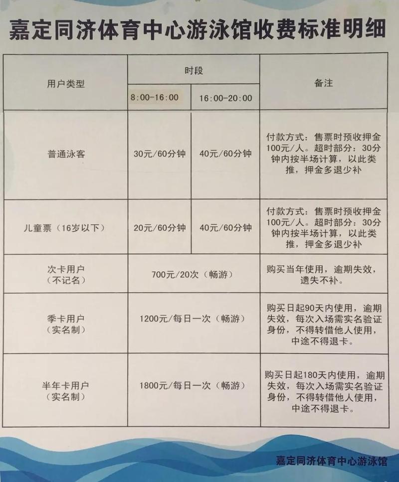 环境:四平路校区游泳馆位于杨浦区四平路1239号校园内,系50米标准恒温泳池,常年水温保持在28℃。同济游泳馆在设计时引入了建筑节能概念,采用屋顶开启技术,有效调节馆内空气,还能在夏季给泳客带来人与自然的亲密接触。游泳馆除冬季需停馆进行年检、保养等安全维护外,常年面向校内教职员工、学生及社会各界人士有偿开放。
