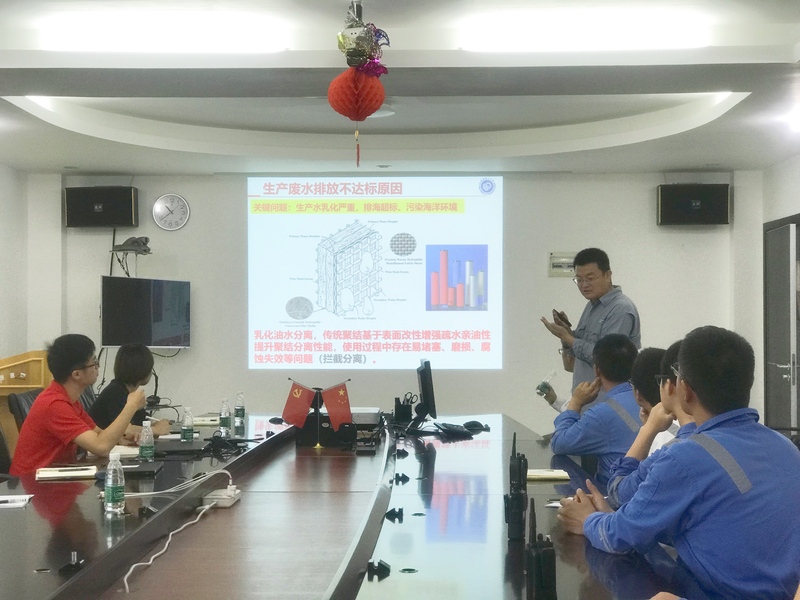 7月29日,实践团队抵达实践目的地,与中海石油崖城作业公司进行项目对接。我校与中海油湛江崖城作业公司的合作始于2015年。当时,崖13-1气田压力下降,气田油水乳化加剧,现有国外进口生产水处理设施无法满足降压生产需求,将直接导致排海超标、污染海洋环境等影响。杨强教授主动与企业对接,带领科研团队攻坚克难,以CFC油水分离技术成功解决了海上气田开发后期高乳化生产水处理难题,使崖13-1气田的生产水排海含油量达到史上最低。