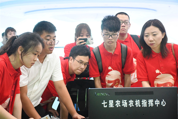 2018年9月25日,习近平总书记在黑龙江省考察时首站来到建三江,关心粮食生产和收获情况,对七星农场及当地农业现代化发展给予了高度肯定,从农业绿色可持续发展、激发农业科技的潜力和动力等方面提出了殷切希望。“我们想跟随总书记的步伐,去学习感悟北大荒的历史发展和沧桑巨变。”重走总书记考察之路,前往七星农场参观学习,这群年轻的大学生感受到了北大荒农业在机械化、信息化、智能化建设全面发展道路上的丰硕成果。在七星农场团委书记余传东的带领下,团队成员先后参观走访了国家农业科技园区、北大荒精准农业农机中心、寒地水稻高科技信息化园区、七星农场稻田画与场史馆。
