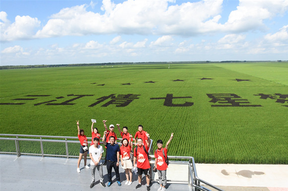 在万亩大地号,团队成员领略稻海麦浪的美景和一望无垠的开阔,体验“横看成垅侧成行,远近高低都一样”垦区工匠精神,这里的水稻不仅好吃,种植得还好看,“三江情七星梦”六个字更是承载了垦区人民的深厚情感和美好憧憬。在七星农场农业信息化的起源地——寒地水稻高科技信息化园区,团队成员进一步了解水稻文化历史和水稻生产科技知识。在稻田画展区,团队成员参观欣赏了由七种水稻栽植,总面积113亩的四幅稻田画,感受水稻种植的艺术和多元作用。