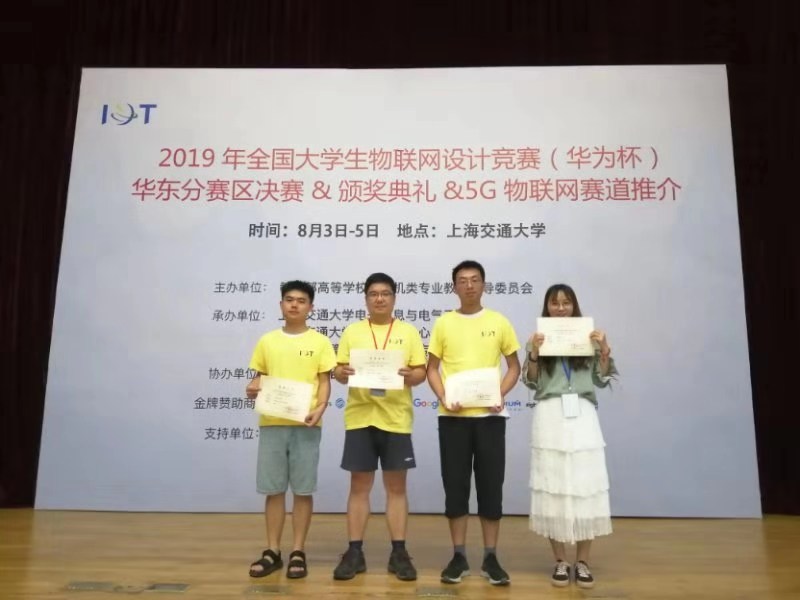 全国大学生物联网设计竞赛是教育部高等学校计算机类专业教学指导委员会主办的物联网领域唯一的学科竞赛。“华为杯”第六届全国大学生物联网设计竞赛于2019年5月启动,竞赛吸引了来自全国560余所高校、近2000支参赛队共计8000余名参赛学生和2000 余名指导教师报名参赛,华东分赛区共收到了100多所院校的近400个参赛作品。经过初选、50多位评审专家的线上评审、华东分赛区组委会评审专家组的反复推敲,有130余支参赛队进入华东分赛区决赛,决赛在上海交通大学软件学院举行。此次我校获奖参赛团队由王晶晶,马磊,杨昊晨组成,指导教师为黄如。获奖参赛作品紧跟时下热点技术,服务于未来智能生活,立意新颖,具有较好的实际应用前景与理论价值。我校参赛队经过与多支队伍的激烈角逐,脱颖而出,获得了华东赛区特等奖。