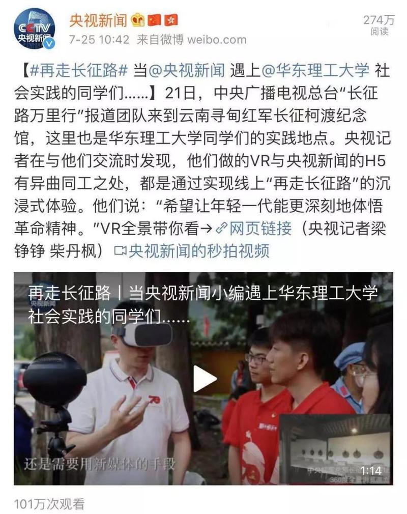 今年是新中国成立70周年,也是红军长征出发85周年。这个暑假,华东理工大学共有19支暑期社会实践团队前往学校定点支援、去年摘帽脱贫的贫困县——云南省寻甸回族彝族自治县,其中商学院实践团跨越2300多公里,到寻甸柯渡镇开展“薪传七十载,重走长征路”活动。沫沫这样的故事,都被学子们用影像镜头记录下来,并利用虚拟现实VR技术加工成片,让“老少边穷”地区的大人、孩子以及其他再走长征路的国人,亲眼见到红军当年留下的基因。