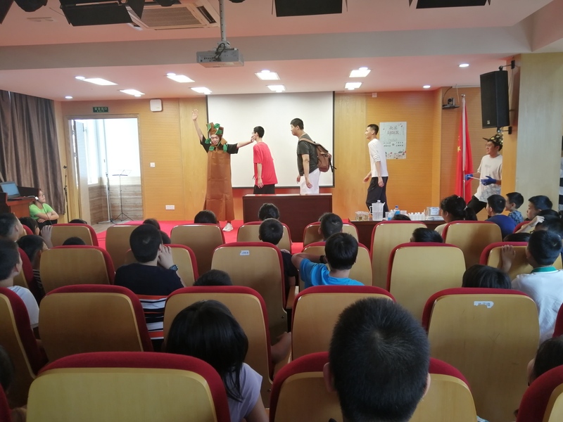 接下来,团队成员为小朋友们带来化工情景剧《森林历险记》。以三位同学在森林中遇见“博士”和“魔法师”为故事开端,将“酒精与乙酸钙制固体酒精”“点不着的纸巾”“制作风暴瓶”等趣味科普实验贯穿到引人入胜的剧情中。