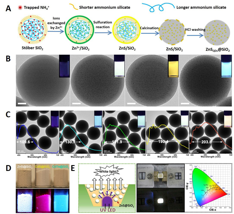 该研究团队开发了一种直接在SiO2小球体相内生长量子点的液相合成新方法——“trapped NH4+”离子交换法(图A)。他们利用“trapped NH4+”易与Zn2+、Cd2+等金属阳离子发生离子交换反应的特性,成功地将金属阳离子引入SiO2小球体相(图A,B),再通过室温硫化直接生成金属硫化合物,最后,通过巧妙的酸洗与醇洗过程(酸的浓度需要调控),可选择性地将SiO2小球表面覆盖的“bulk”硫化物洗掉,再通过高温煅烧实现SiO2小球体相量子点的晶化。在煅烧过程中,利用SiO2小球体相孔道的“限域效应”,有效抑制了量子点晶化过程中团聚现象的发生。与此同时,不同尺寸孔道的“限域效应”可以很好地控制量子点的尺寸分布,使制得的量子点在紫外光照射下直接发射白光。由于传统通过三原色量子点的组合构筑白光LEDs的方法重现性较差,且量子点发射波长的半峰宽难以控制,而“trapped NH4+”离子交换法合成量子点的策略,可通过调节煅烧温度,控制SiO2小球的孔道尺寸分布,从而实现对ZnS@SiO2等量子点荧光发射光谱半峰宽的调控(半峰宽可从109.6调节到203.8nm,图C)。值得注意的是,整个量子点的合成过程是在纯水体系中完成,不需要任何油相试剂,也不需要加入任何有机“capping-agent”。
