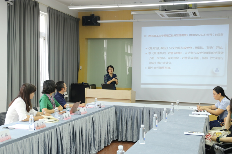 会议首先邀请张雪芹给大家解读《华东理工大学教师师德失范处理办法》。张老师讲解了《办法》出台的背景和意义,然后从组织保障、师德失范行为、处理的类别和适用、处理程序、处理的解除等五个方面对《办法》进行了详细解读,让大家了解了文件的精神和内容,并希望大家要以“四有”好老师的标准严格要求自己,把立德树人落实到工作的每个环节中。