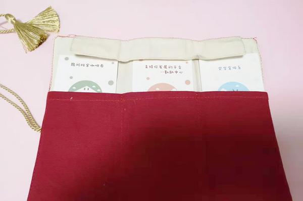 一个笔袋、一套书签,看似美观实用的文具用品,实则是华东理工大学在"绿色通道"为家庭经济困难学生准备的"锦囊妙计",分别是"勤奋求实·学习囊""励志明德·实践囊""生活无忧·爱心囊"。学习囊包含了对学校奖助体系的介绍以及一张学长联系卡,实践囊包含了勤助岗位体验以及资助志愿者服务队的介绍,爱心囊包含了一张价值1000元的爱心卡、毛毯卡以及咖啡体验券。