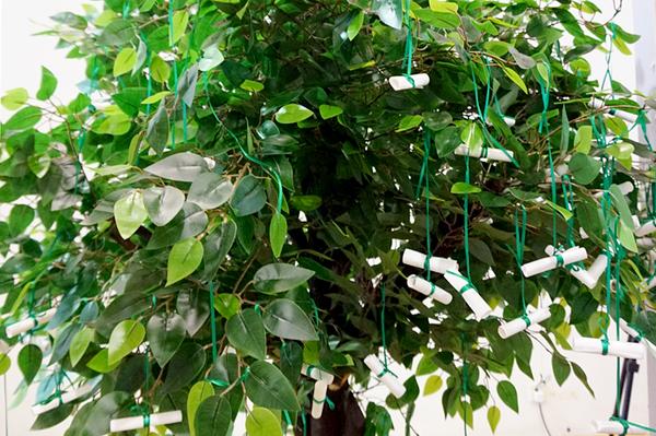 在"绿色通道"现场,学校还设置了一棵"妙计树",郁郁葱葱的榕树上悬挂着一个个卷轴,每个卷轴都承载着师生对新生的寄语。