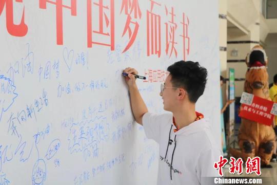 刚刚荣获第45届世界技能大赛花艺项目金牌的2019级新生陆亦玮在签名墙上写下自己的入学宣言。 供图