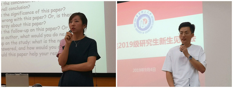 任国宾就学院历史、师资力量、学科发展等简单介绍了学院情况和学院研究生培养情况,并就学术规范对同学们提出了严格的要求,希望新生诚实守信,脚踏实地做科研、做学问。青年教师代表梁欣从科研工作的敲门砖“文献阅读”的角度切入,为新生解析了文献的重要性,并就如何有效提取文献信息分享了许多有效的学习方法。学生代表曾任上海市学联副主席、校研究会主席的郭春阳同学,从课程学习、科研训练和学生工作三个层面与新生分享了从自己的成长之路。