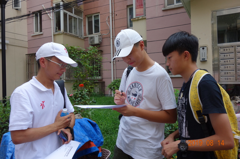 图片说明:实践团队成员于紫薇新村发放调研问卷