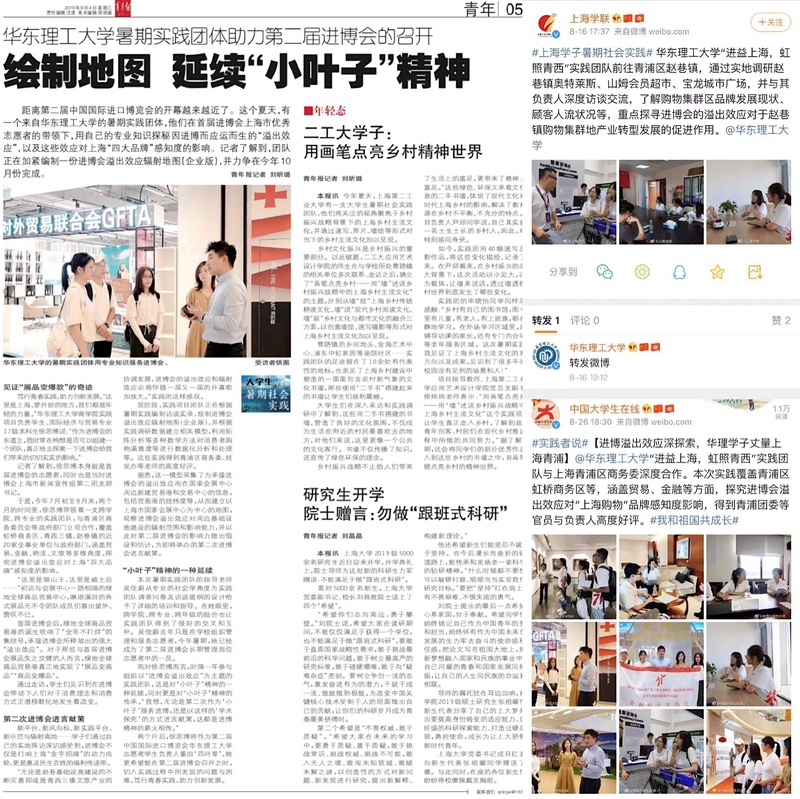 在为期近两月的实践调研中,实践团队一致认为进博会不仅是打响上海“金字招牌”的动力齿轮,更是惠及民生百姓的福利传送带。作为进博会的见证人和受益者,团队成员相信,进博会的溢出效应和辐射效应必将伴随一届又一届的开幕愈加放大。现阶段,实践团队正加紧编制一份进博会溢出效应辐射地图(企业版),这些实践结果也得到青浦区商务委、经发办等政府官员的高度好评,并得到青年报、青春上海的专题报道,同时也受到教育部中国大学生在线、上海学联等关注。