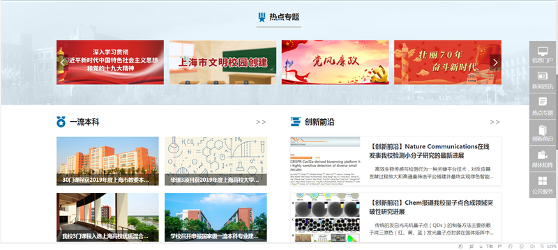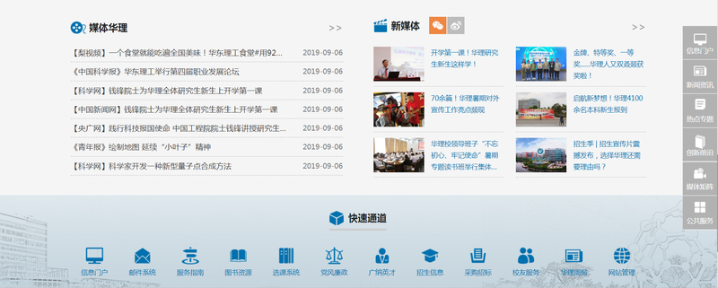 而在功能和模块设计上,新版主页也亮点多多:一级栏目经过梳理整合更加精炼,精准对接用户需求习惯和学校中心工作;主页右侧的导览模块涵盖“信息门户”“新闻资讯”“热点专题”“创新前沿”“媒体矩阵”“公共服务”等常用需求,更好地服务用户;新增的“一流本科”“创新前沿”等模块,更加契合学校聚焦“双一流”建设的重点需求,助力唱响华理“一流声音”;新增“深度报道”和“新媒体”板块以及学校入驻的各大信息聚合新媒体平台,凸显了学校深入推进融媒体建设、加强多元立体化宣传的工作理念。